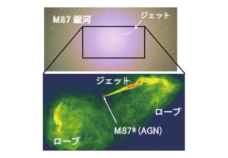 例えば、天の川は無数の星の集団ですが、これは天の川銀河(銀河系)と呼ばれています。太陽系もその縁付近に位置しています。同様の無数の星の集団からなる天体を「銀河」と呼びますが、この銀河が宇宙には無数にあります。たいていの銀河(不規則銀河以外)の中心には超巨大なBHが存在するといいます。その中にはその中心領域が非常に活発に活動していて強い光やジェットというガス(プラズマ)の流れを噴出しているものがあります。図1(上図)はM87銀河という銀河系から5400万光年彼方にある巨大な銀河(楕円銀河)です。その中心から放射されるジェットが観測されています(図1下図)。ジェットはガスの高速な流れですが、ガスの流れが光速度を超える観測がされています。この現象を『超光速度運動』(superluminal motion)を言います。超光速度運動は実際にガスが光の速さを超えて流れているのではなく、光速度に近い速度のガスがほとんどわれわれの方向に運動しているものとして説明されています。いずれにしてもガスの速さが光速度に近いということになります。このような高速度のガスをともなったジェットを「相対論的ジェット」と言います。相対論的ジェットは銀河中心領域の非常に激しい現象から形成されると考えられています。銀河中心付近の激しい現象が起こる領域を「銀河中心核(AGN: active galactic nucleus)」といいます。AGNは銀河の超巨大BHを中心とする激しい現象を引き起こしている領域と考えられています。その活動性は高く宇宙で最も明るい領域と言われています。すなわち、BHが暗い天体という捉え方とはかけ離れたBHの周りは非常に明るいということが明らかにされました。最近、M87のBHの影が電波観測により撮像されましたが、その影はこの非常に明るい光源によりBHが照らされているために現れます。