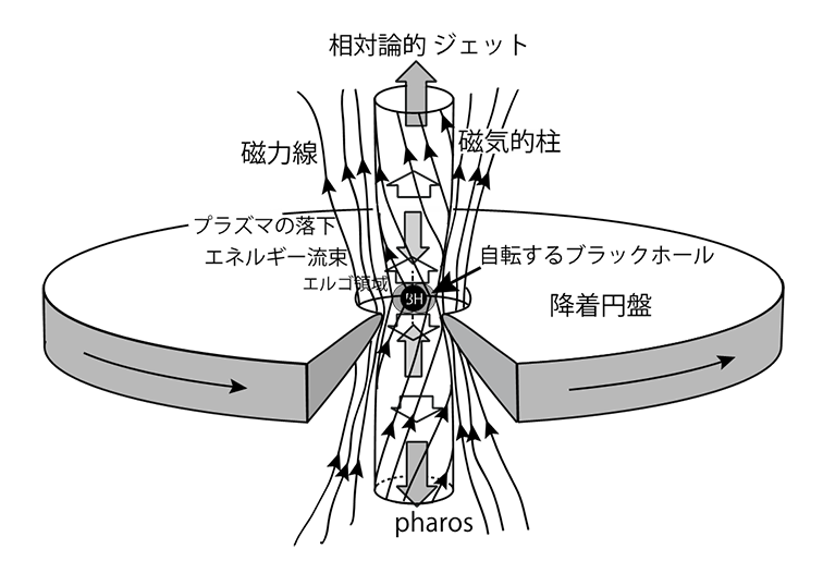実は、BHの特徴はその重力の強さに比して非常に小さいというところにあります。そのためBHにはなかなか近づけないのです。このなかなか近づけないというのがBHの特徴の最たるものです。例えて言うならば、天井から目薬をさすくらいBHに落下するのは難しいのです。というのも、「角運動量保存」という物理法則のためちょっとでもBHに対して回転する物体はBH近くで光速度に近い速さで回転することになり遠心力のため近づけないのです。ここで、BHがなんでも吸い込んでしまうものという捉え方が通用しないことがわかります。BH近くにはBHに落下できなかった宇宙のチリやガスが集まることになります。それらがてんでバラバラな運動をしていても、衝突していずれは「降着円盤」と呼ばれる円盤状の天体を作ります(図2)。降着円盤の内部のチリやガスが衝突したりすれあったりして高熱を発します。これが降着円盤が強く輝く原因となります。また、降着円盤内では磁場が自然に発生増幅されて降着円盤に大きな影響を与えます。磁場を含んだ降着円盤のガスはブラックホールに近づき、その磁場がブラックホールの回転軸方向に引き伸ばされて累積することで非常に強い磁場を形成します。その磁場はBHの地平面(光が外には出ていけない領域の表面)を貫通した柱状の領域になります。そのような磁場が非常に強い領域を『磁気的柱』(magnetic pillar)といいます(図2)。