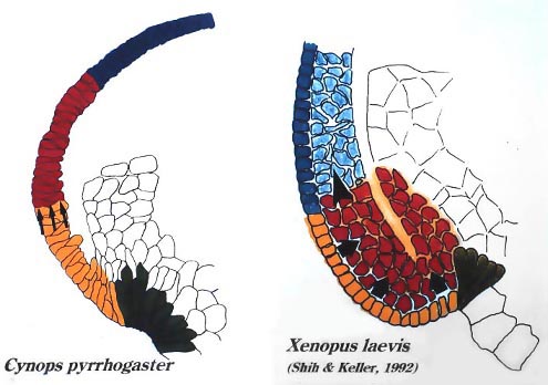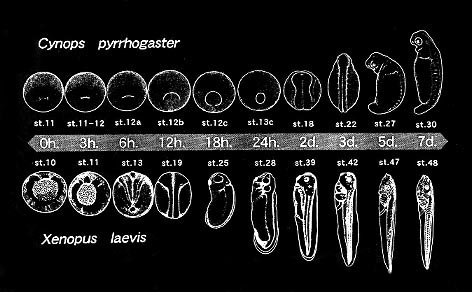 Comparative development between Cynops pyrrhogaster at 20and Xenopus laevis at 23. The developmental profiles were reproductions of the figures of Okada and Ichikawa (1947) in Cynops pyrrhogaster and Nieuwkoop and Faber (1967) in Xenopus laevis.