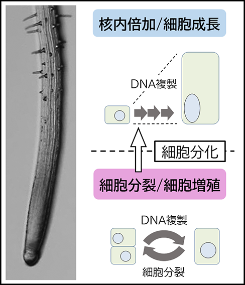 植物の体が大きくなる仕組みは、主に二つの要素で決まります。一つは細胞の「数」を増やす「細胞分裂」。そしてもう一つは、細胞一つ一つの「サイズ」を大きくすることです。この細胞サイズを大きくするユニークな仕組み「核内倍加(かくないばいか)」を私たちは研究しています。核内倍加は、細胞分裂をやめた後、細胞の中で生命の設計図であるDNAだけを複製していく現象です。DNAの量が増えるのに対応して、細胞は風船が膨らむように大きく成長していきます。植物は、この「細胞分裂」と「核内倍加」のタイミングを巧みに切り替えることで、葉や果実を適切な大きさや形に作り上げているのです。